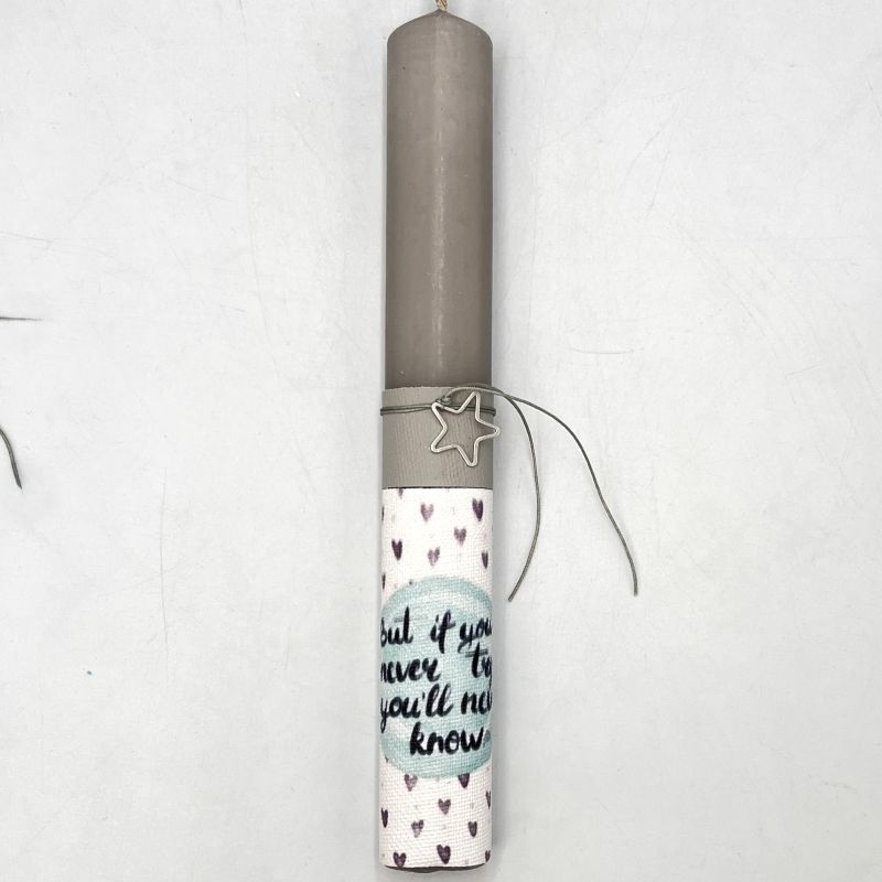 Χειροποίητες λαμπάδες σε vintage – retro ύφος με μήνυμα “but if you never try, you’ll never know” και μεταλλικό διοακοσμητικό καρδιά, φεγγάρι ή αστέρι.