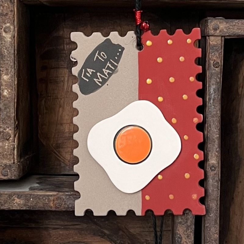 Χειροποίητο Κεραμικό γούρι σε σχήμα γραμματόσημου και αυγό…μάτι!!! κρεμαστό από το εργαστήριο κεραμικής “Ορτύκι”.