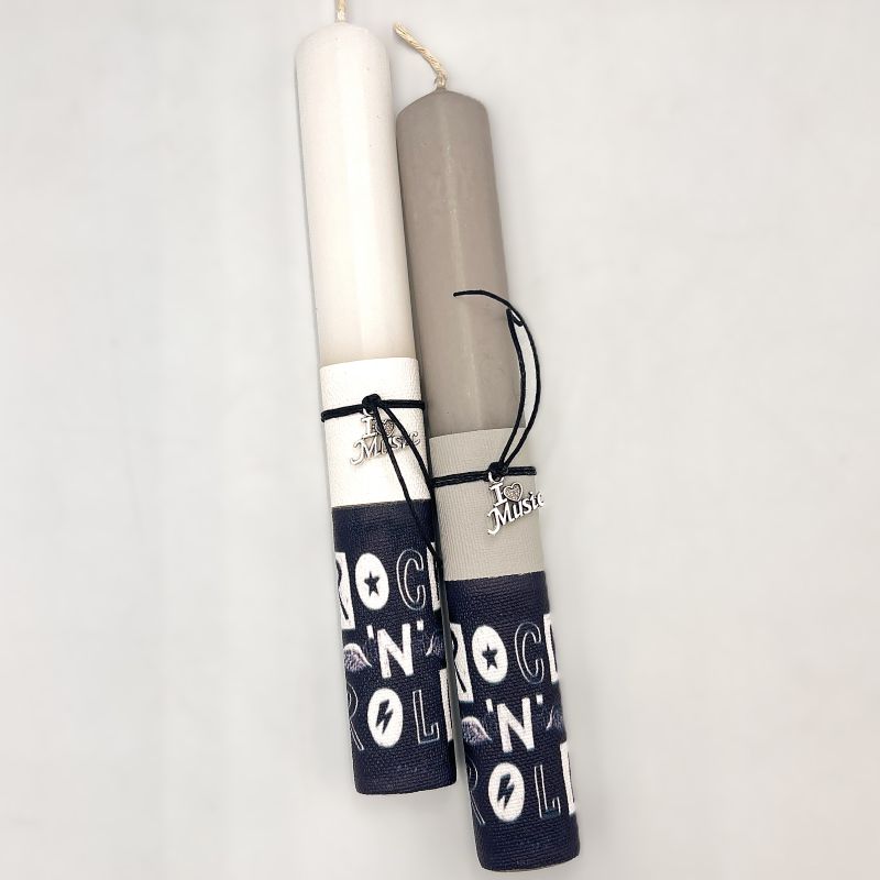 Χειροποίητες λαμπάδες με μήνυμα Rock n Roll και μεταλλικό διακοσμητικό κιθάρα από το εργαστήριο Vretti-Vretta.