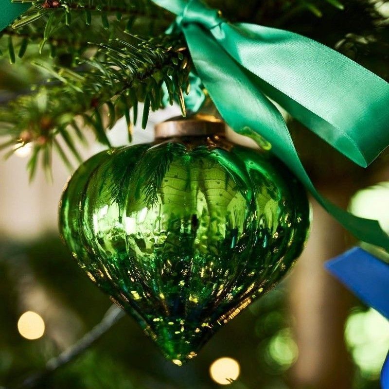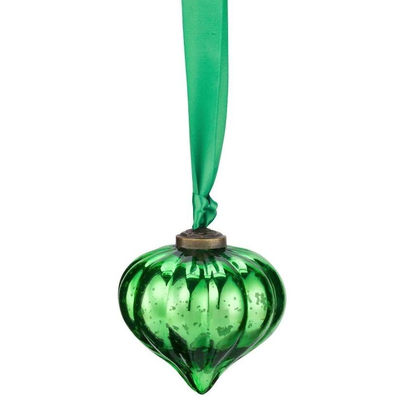 Χριστουγεννιάτικο στολίδι γυάλινη μπάλα με πτυχώσεις σε πράσινο μεταλλικό χρώμα.