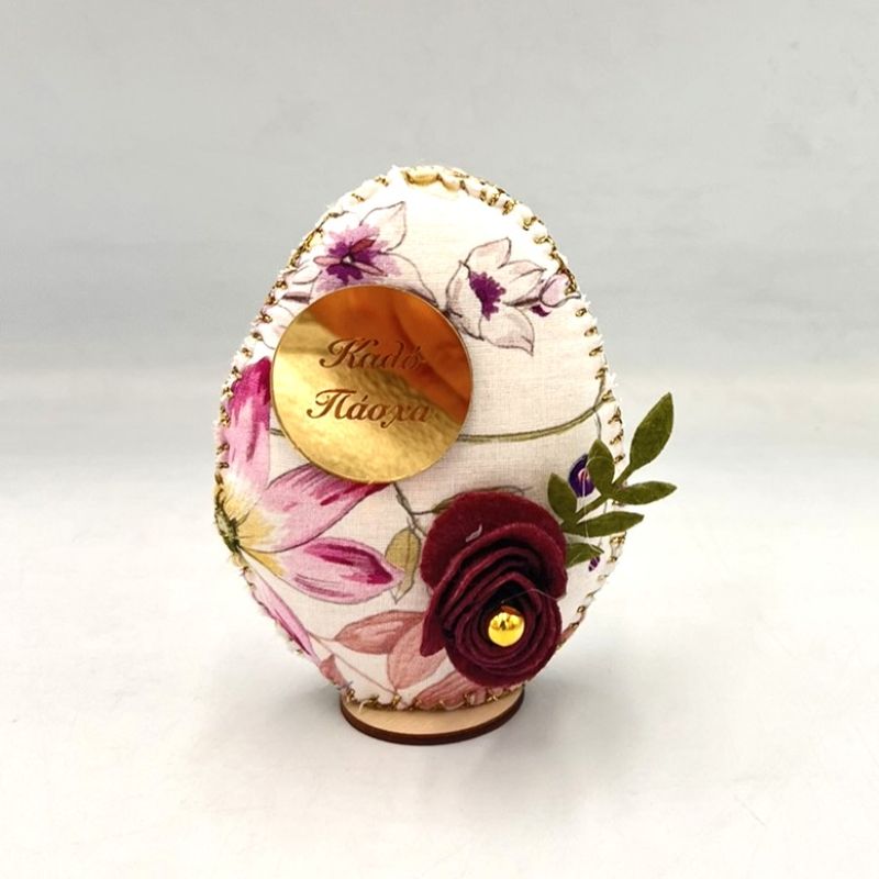 Υφασμάτινο χειροποίητο διακοσμητικό αυγό σε ξύλινη βάση από το εργαστήριο Vento-Evento!